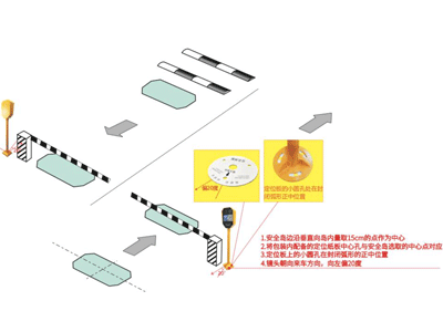取出立桿包裝內(nèi)配備的定位紙板以安全島垂直向島內(nèi)15cm為安裝固定中心點(diǎn),“鏡頭朝向”箭頭平行車道向來車方向偏左20度用M12的鉆頭打孔(立桿內(nèi)配備為M10膨脹螺栓),將電源線、網(wǎng)線和信號(hào)線連接后,將設(shè)備固定